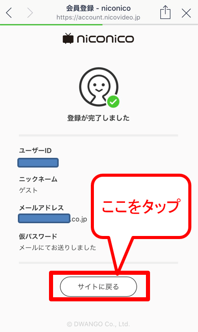 「登録完了して、サイトに戻る」をタップ